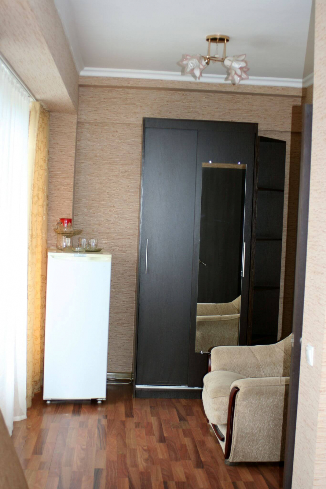 Площадь номера - 28 кв.м. 2 осн. места. 2 доп. места. Балкон. Мебель: вешалка, зеркало, кресла, кровать двуспальная, прикроватные тумбочки, столик журнальный, шкаф. Оборудование: кондиционер, телевизор, утюг (по запросу), холодильник. Санузел: с душем, фен (по запросу). Сервис: смена полотенец, смена постельного белья, уборка номера.